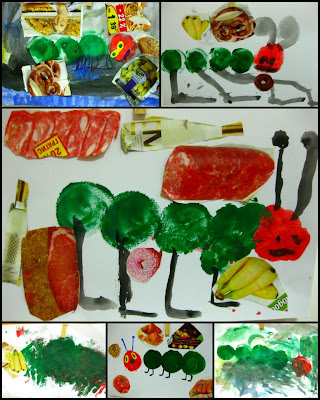 Направихме гъсениците с отпечатъци от балони, антените и краката с четка и накрая им набавихме за ядене (и пиене) картинки от рекламни брошури.