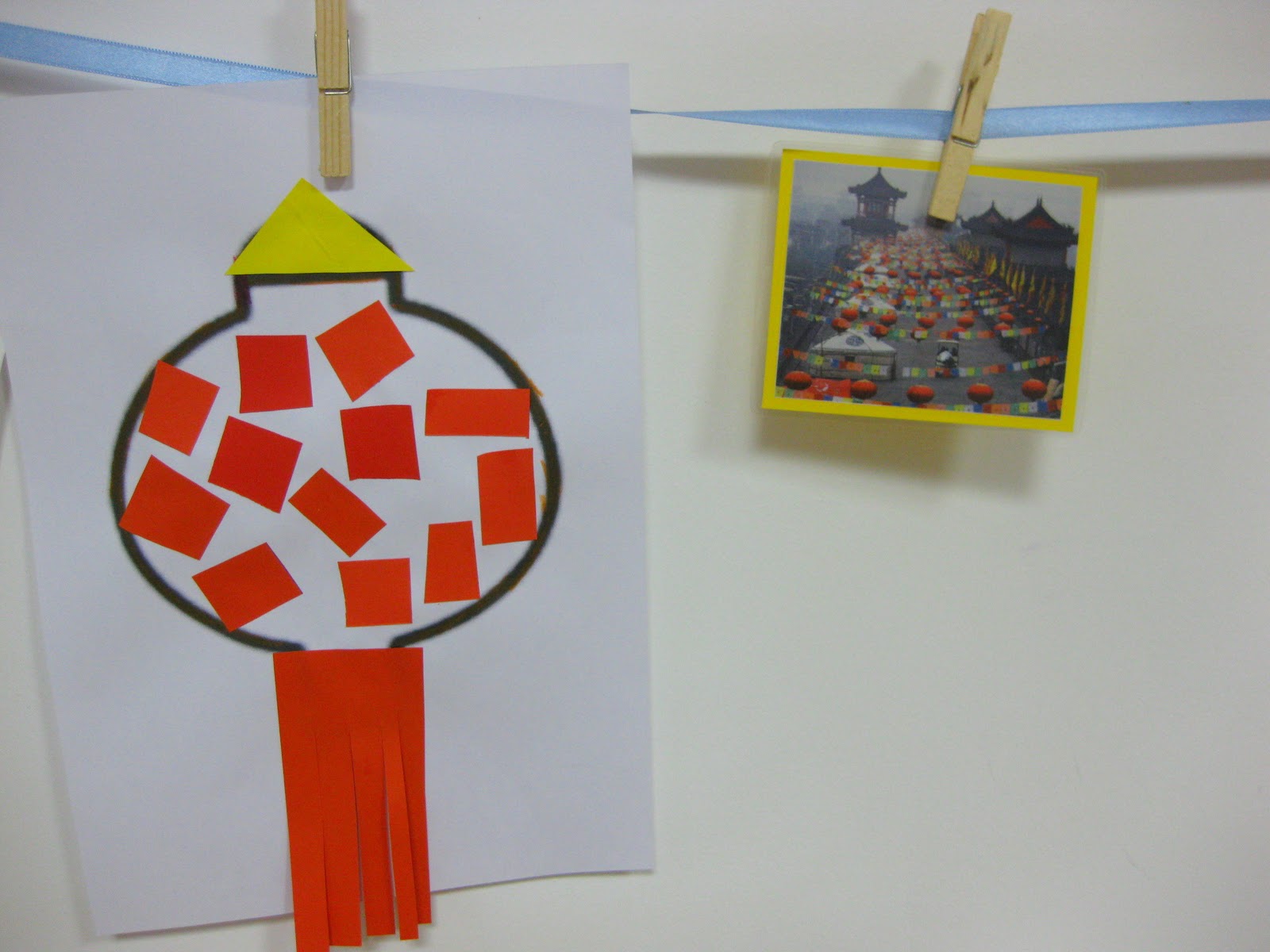 Лесен колаж, изобразяващ китайски хартиен фенер. Децата имат очертанията, трябва да залепят цветните хартии.