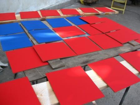 След като боята изсъхна, изрязах букви от шкурка и ги залепих със специално лепило спрей върху пластините.